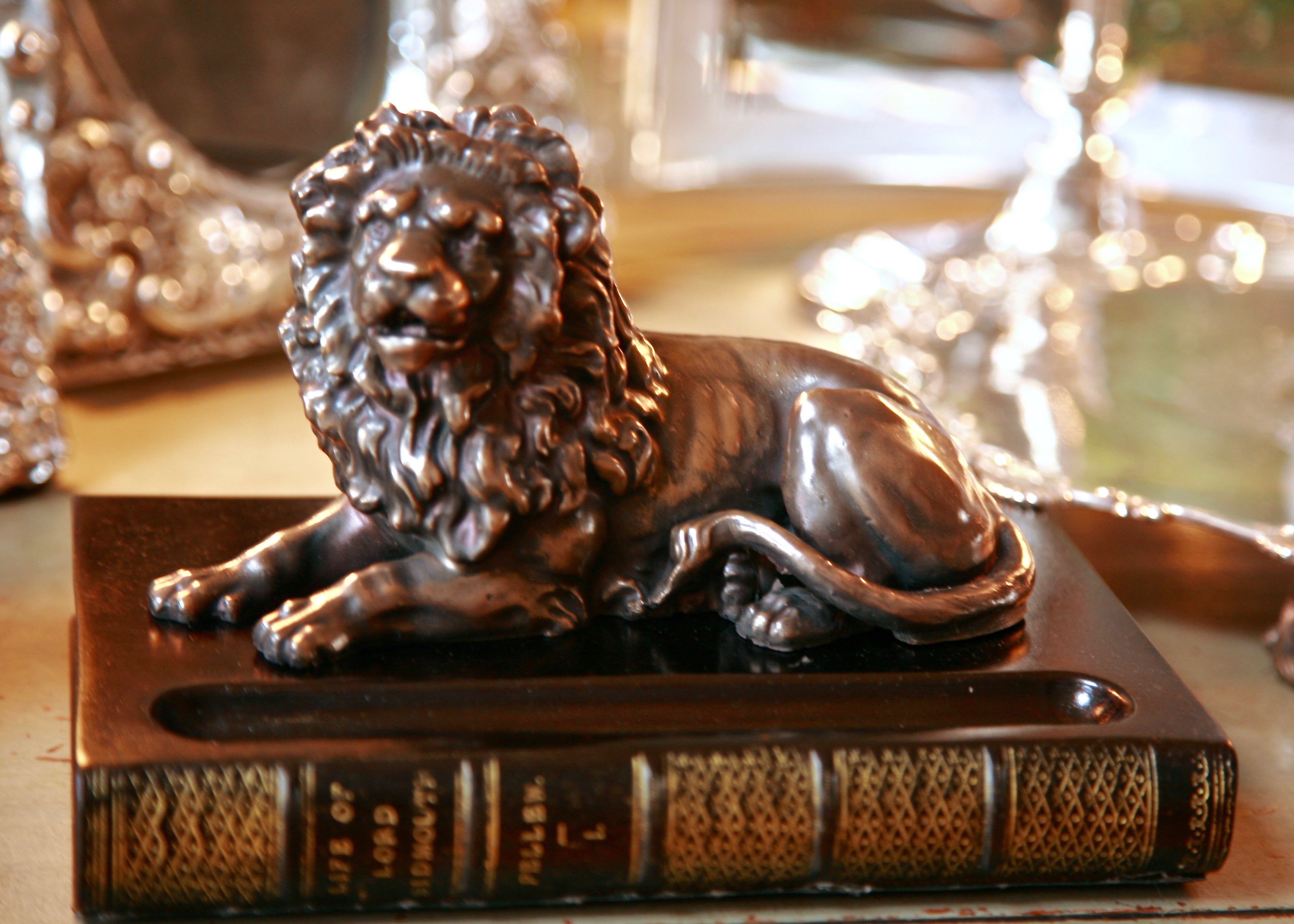 Our craftsmen lovingly create this opulent lion in bronzed cold cast resin sitting on a beautiful Antique faux book.