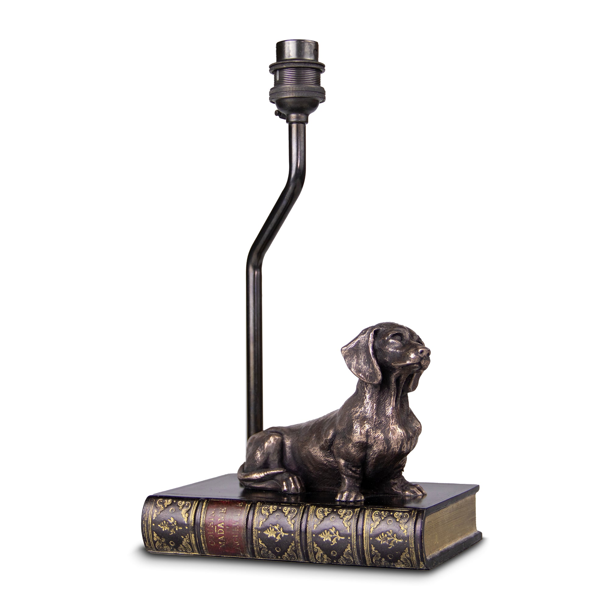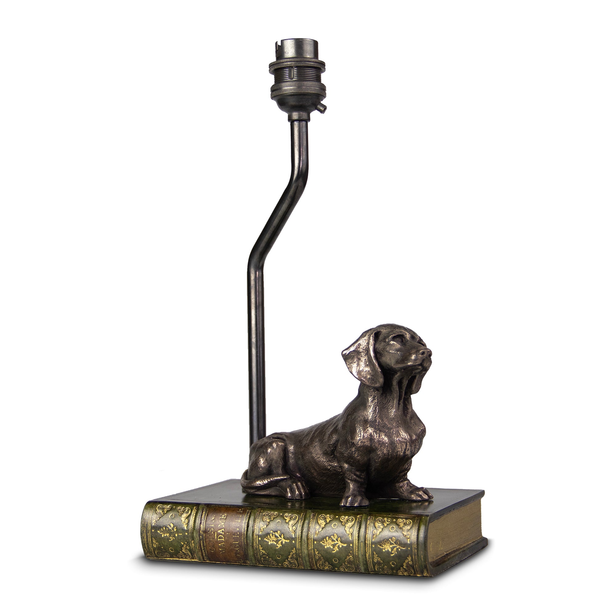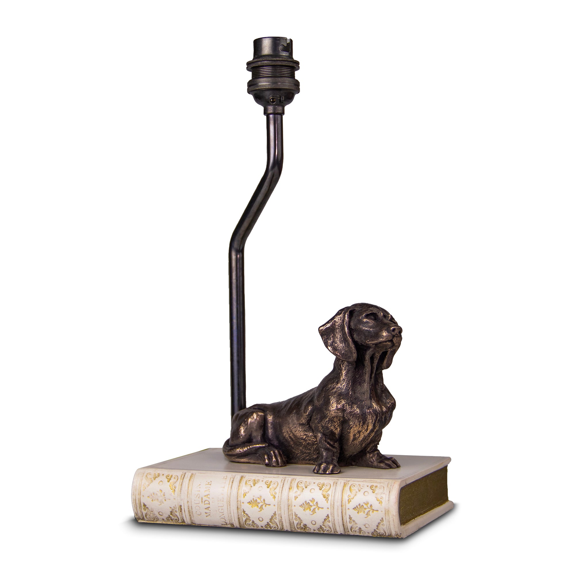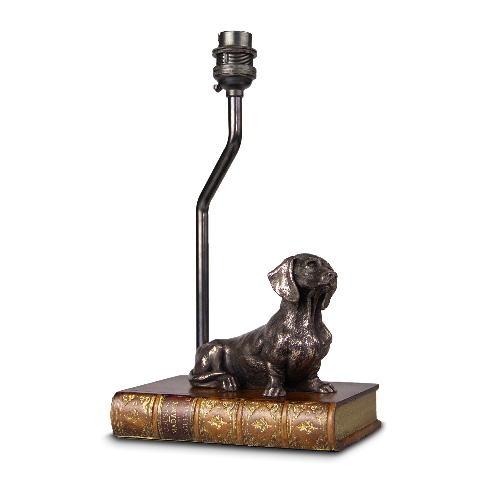 An inquisitive bronzed dachshund statuette sitting atop one of our classic faux books to form the base of this lamp, available hand-painted in all five of our signature colourways.